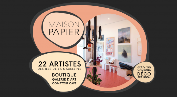 Maison Papier est une galerie d'art, une boutique ainsi qu'un comptoir café qui présente le travail de plus de 20 artistes des Îles de la Madeleine. Il y a les oeuvres originales, ainsi qu'une collection de reproductions d'une centaine d'oeuvres imprimées sur papier. Maison Papier souhaite faire découvrir le talent des artistes d'ici tout en rendant l'art davantage accessible et abordable, et ainsi offrir des oeuvres qui inspirent et embellissent le quotidien. Le tout agrémenté d'un comptoir café et terrasse avec vue imprenable sur la Dune de l'Ouest et la lagune du Havre-aux-Basques. Situé au coeur de La Montagne, à Bassin, à même le magnifique Petit Hôtel de la Montagne. Un détour incontournable ! BOUTIQUE - GALERIE D'ART - COMPTOIR CAFÉ
