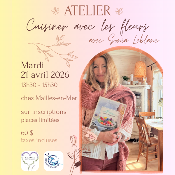 L'atelier comprend la dégustation de recettes et boissons déjà préparées. Chaque participant, recevra une boîte comprenant des fleurs séchées, des recettes à faire chez soi, un bon rabais de 10% pour achats à la boutique Salomia ainsi qu'une participation au tirage d'un sac cadeau de produits de la boutique Salomia d'une valeur de 60$!